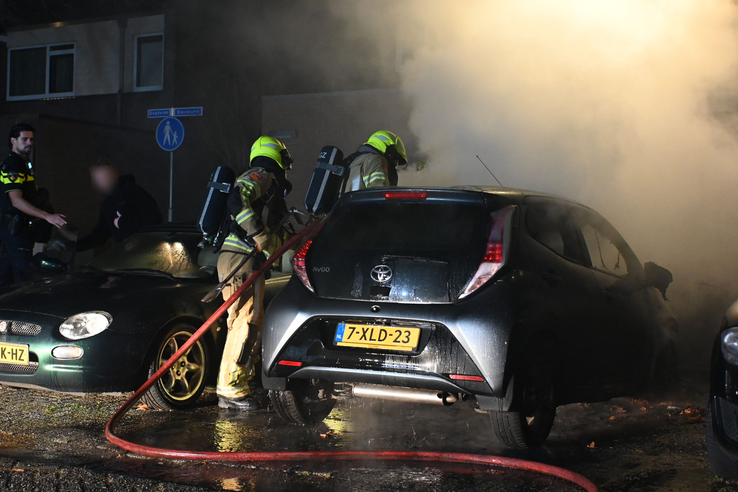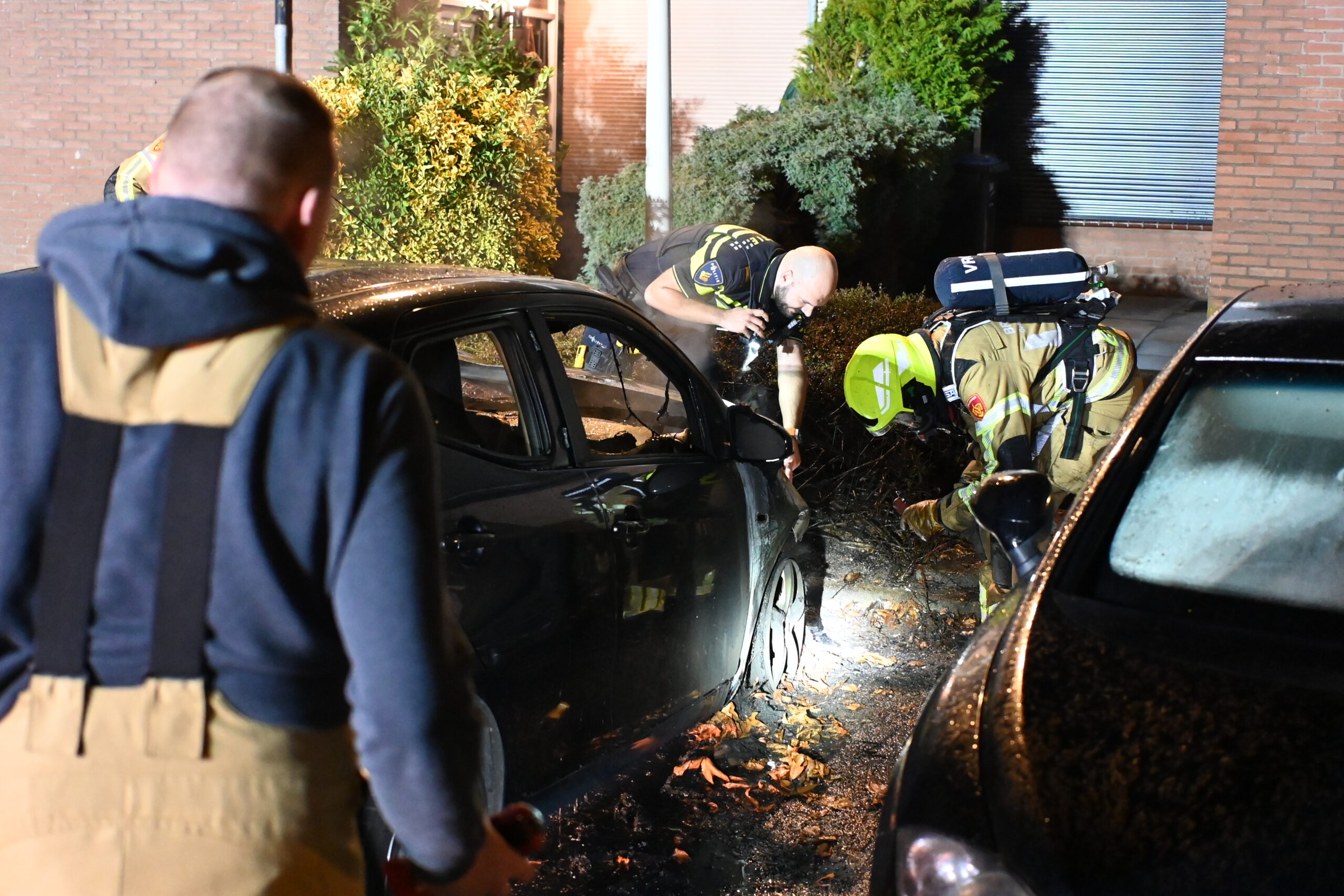 De brandweer wist te voorkomen dat het vuur oversloeg naar naastgelegen voertuigen. Deze auto’s liepen wel schade op door de hitte van de brand.