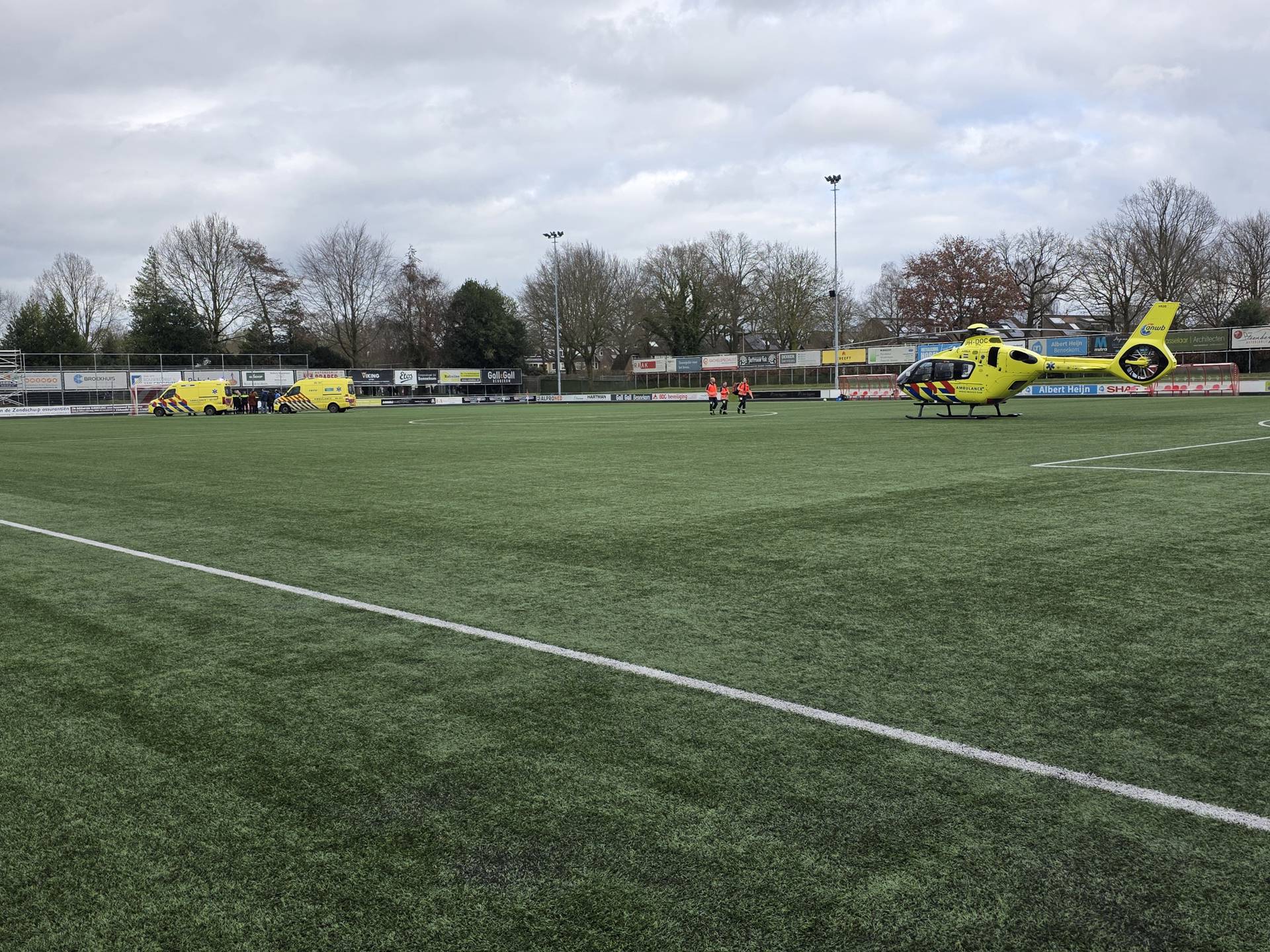 Voetballers botsen hard, traumahelikopter landt op het veld