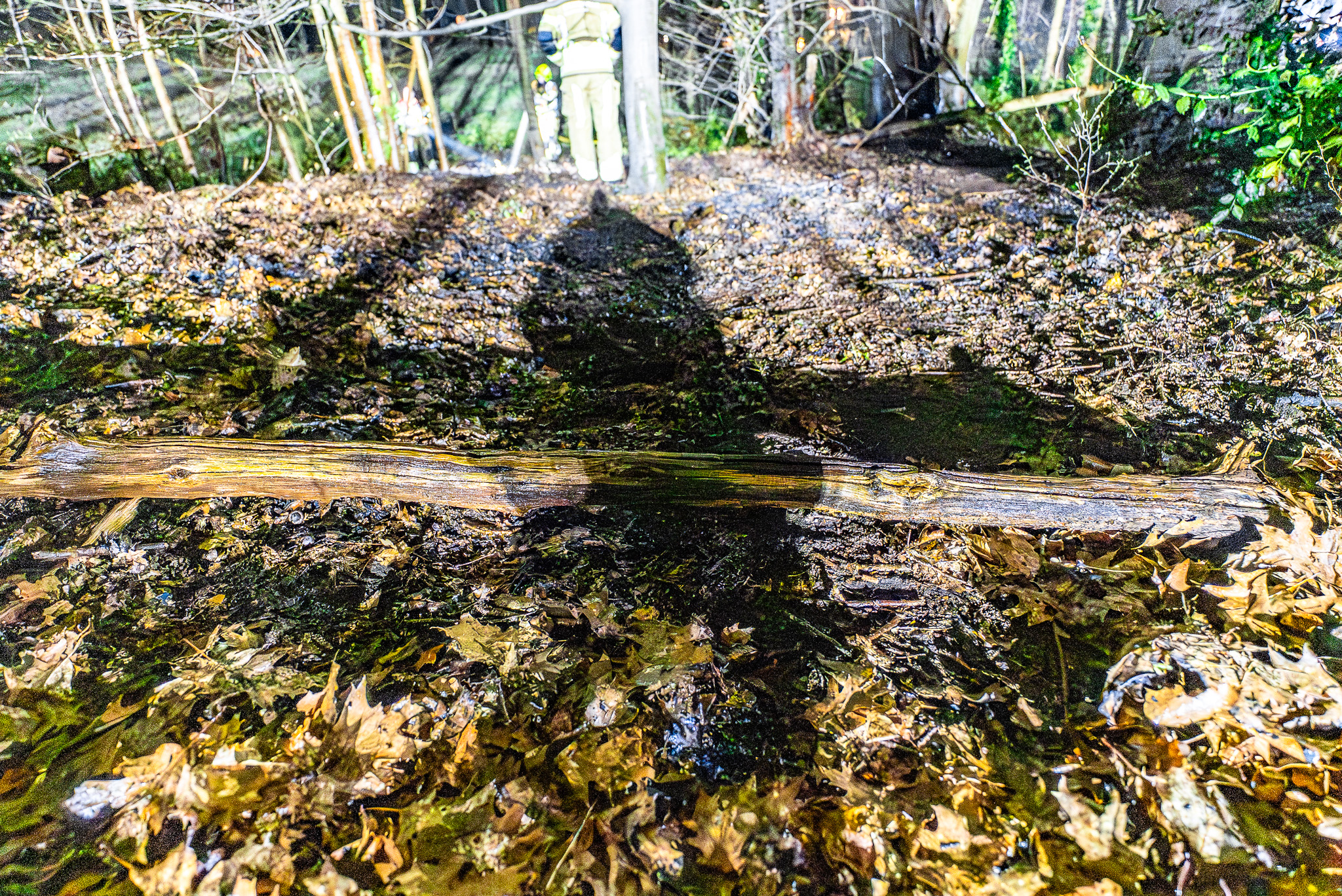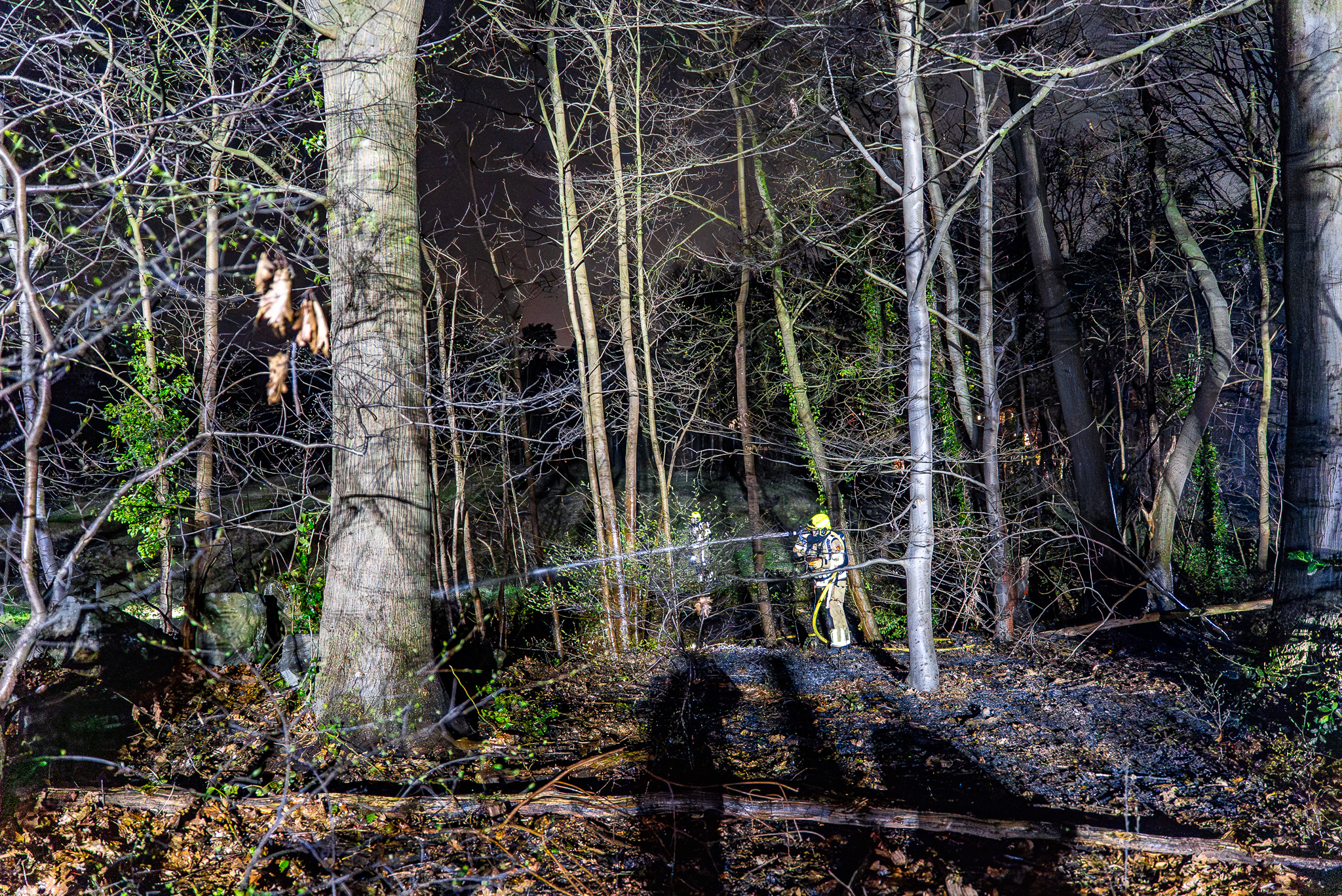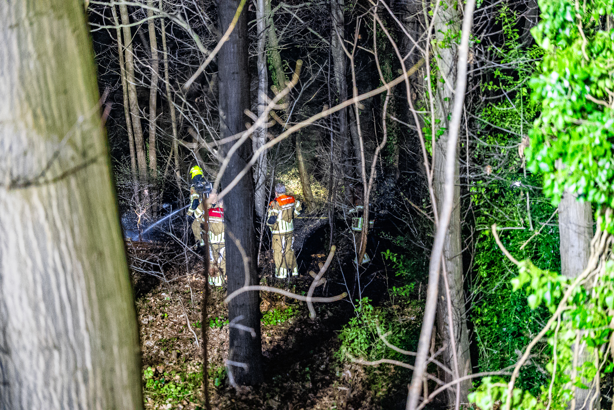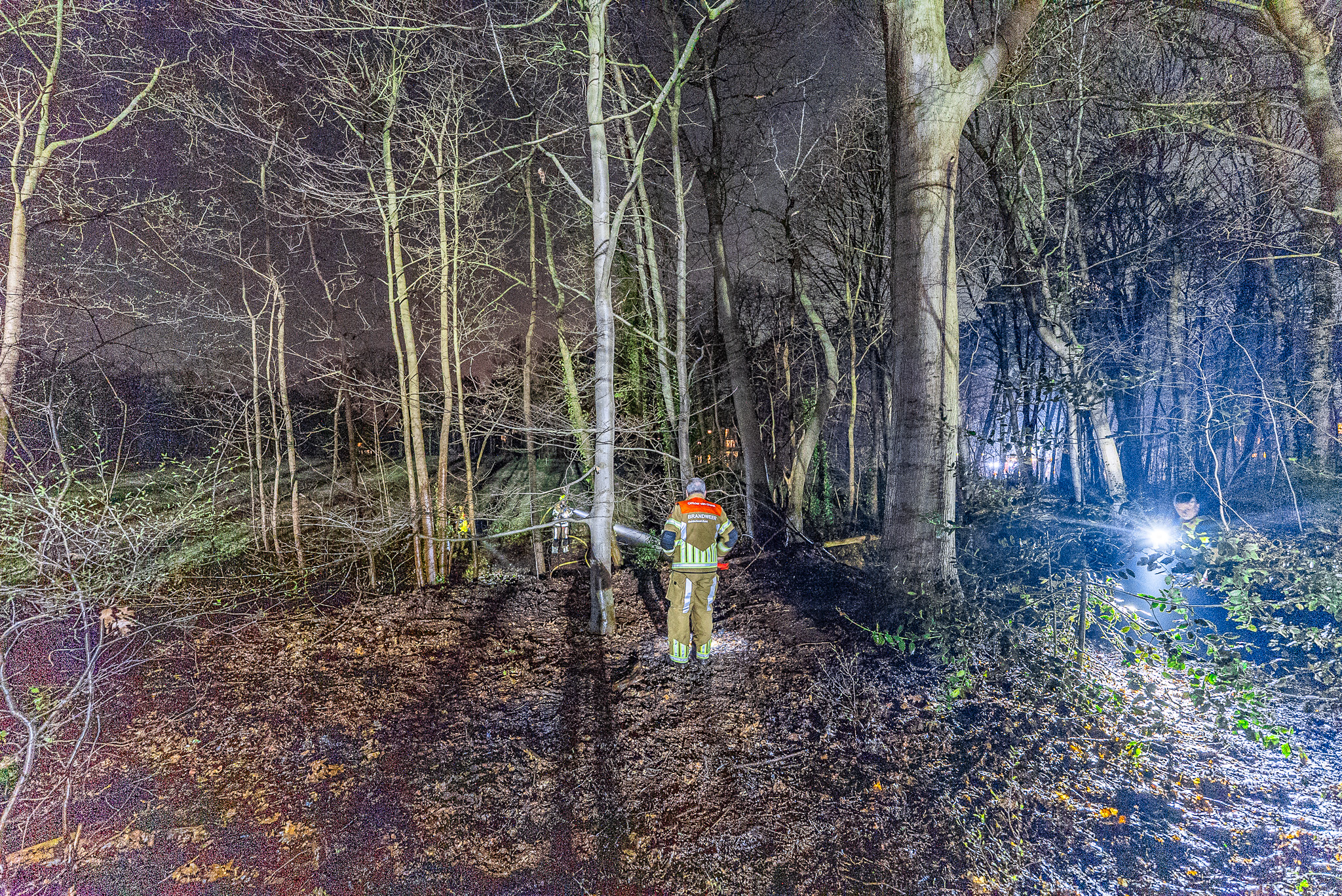 Bij aankomst van de hulpdiensten waren vlammen zichtbaar op de bosgrond. Volgens een agent stond ongeveer 20 vierkante meter in brand. Het vuur bleef voor zover bekend aan de oppervlakte en drong niet door in de bodem.