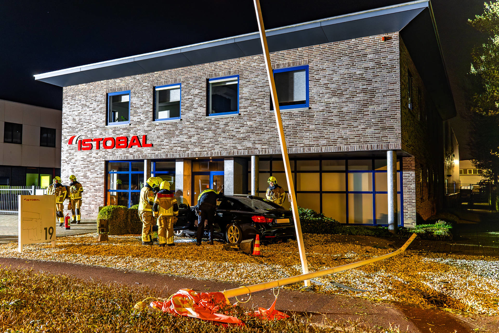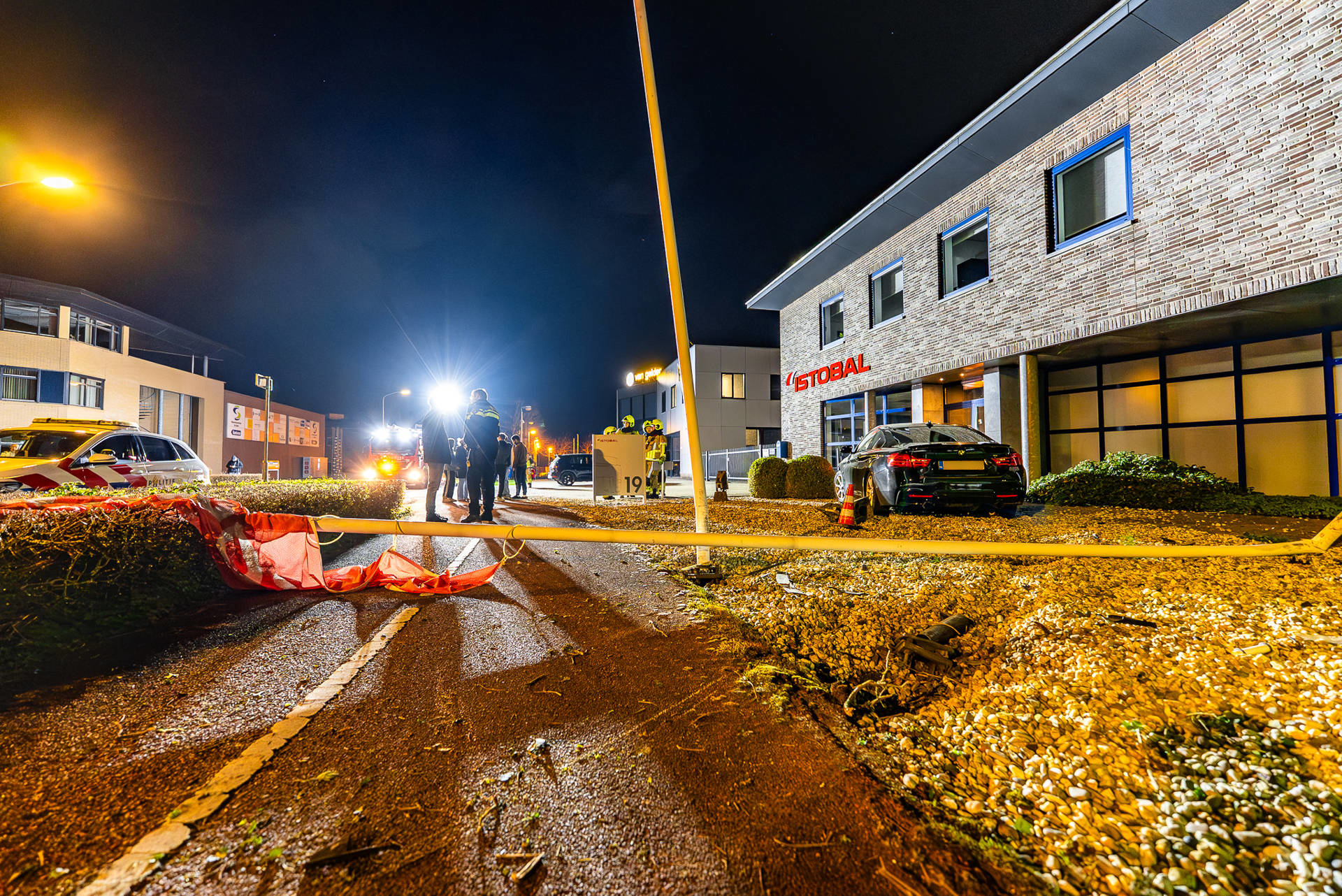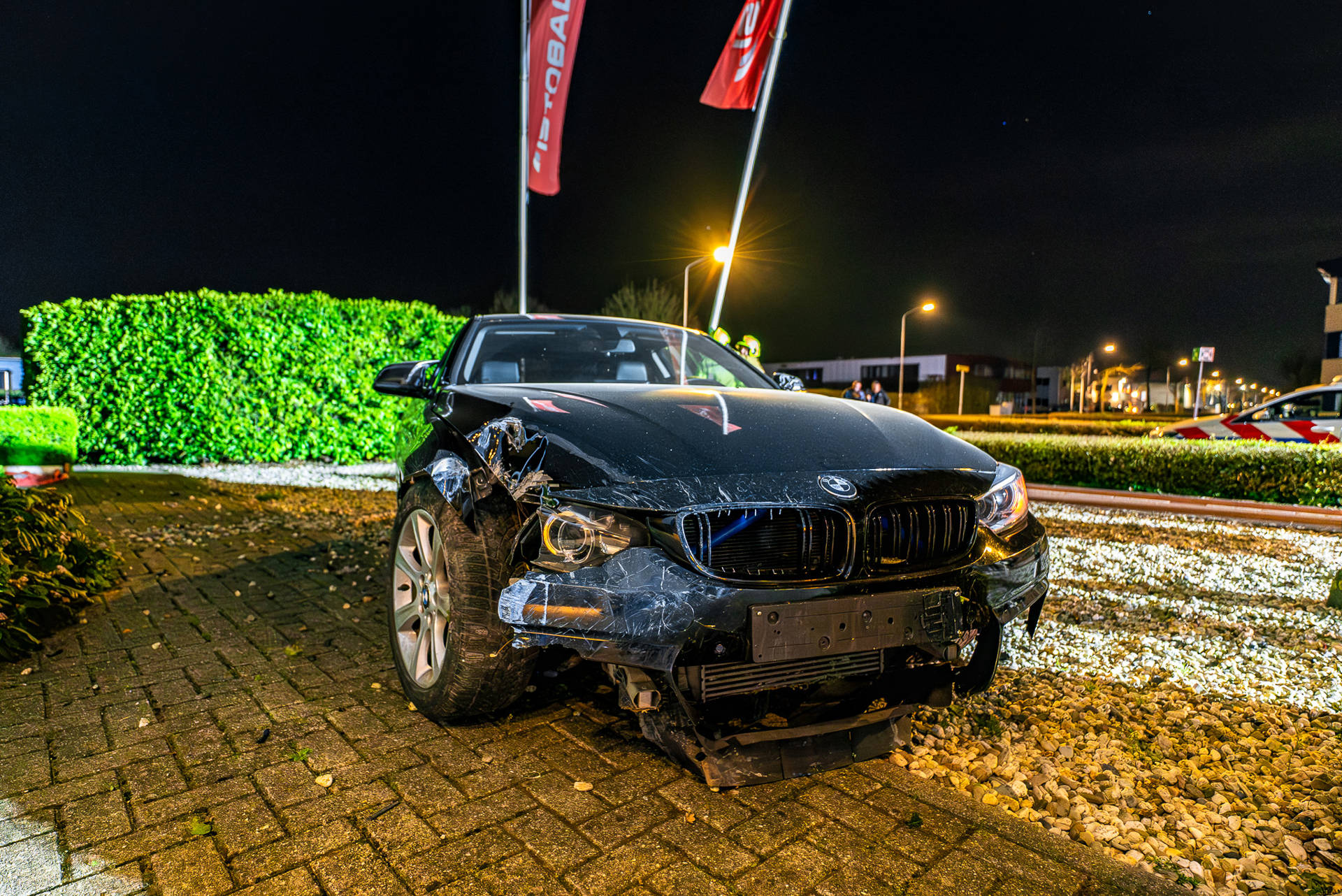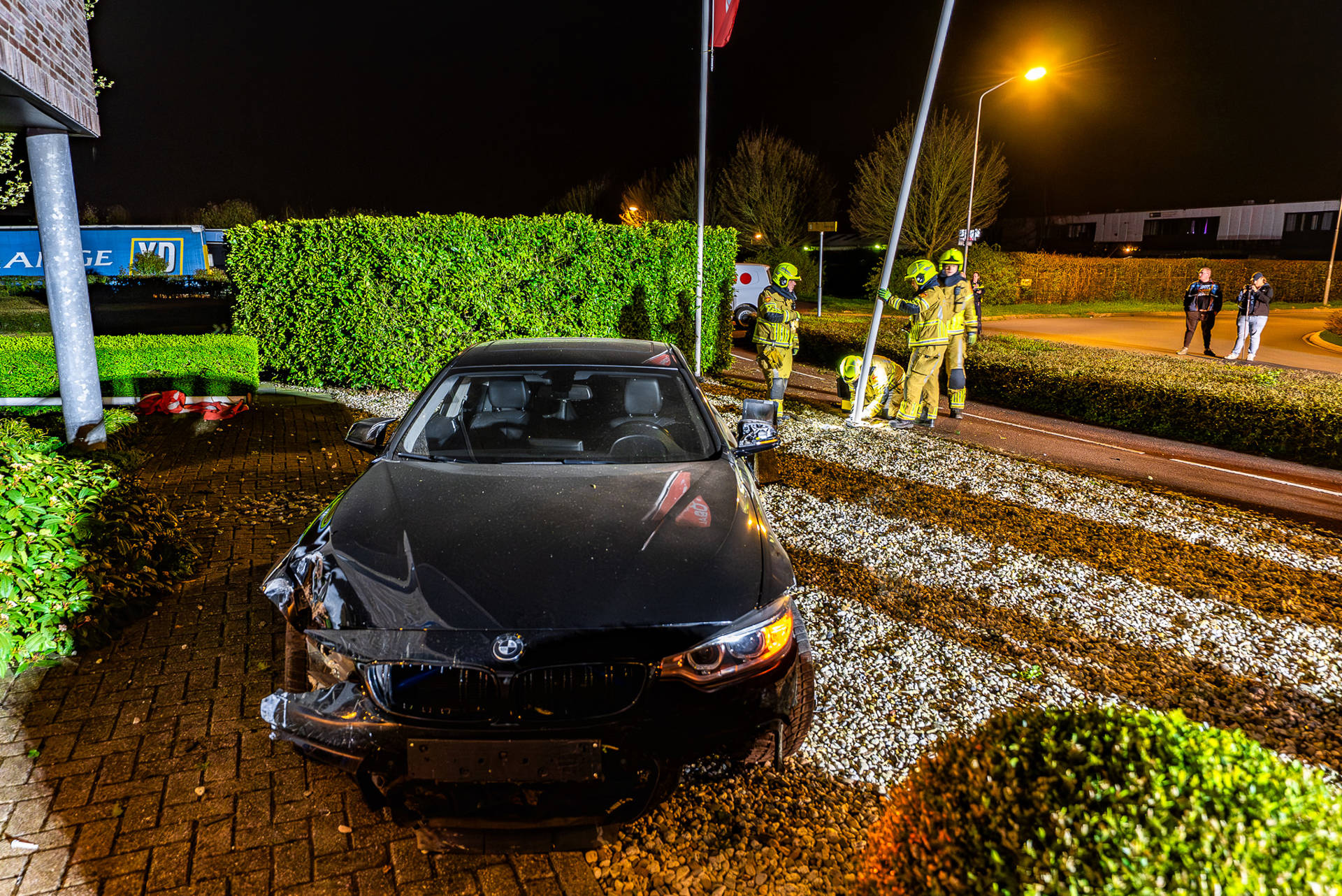 De bestuurder is door ambulancepersoneel gecontroleerd, maar raakte niet gewond. De zwaar beschadigde auto is afgesleept door een bergingsbedrijf. Brandweerlieden hebben een afgebroken stroomkabel van de lamp veiliggesteld en de twee beschadigde vlaggenmasten verwijderd.