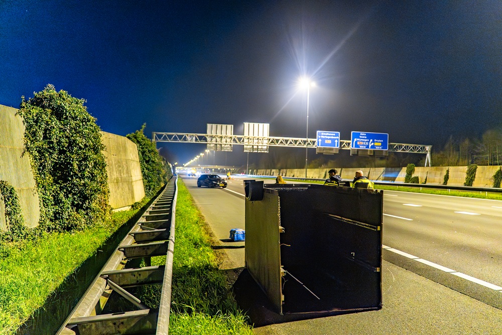 Door nog onbekende oorzaak schoot het bakgedeelte los, waarna apparatuur over meerdere rijstroken verspreid raakte. De politie hielp samen met de bestuurder om de spullen van de weg te halen.