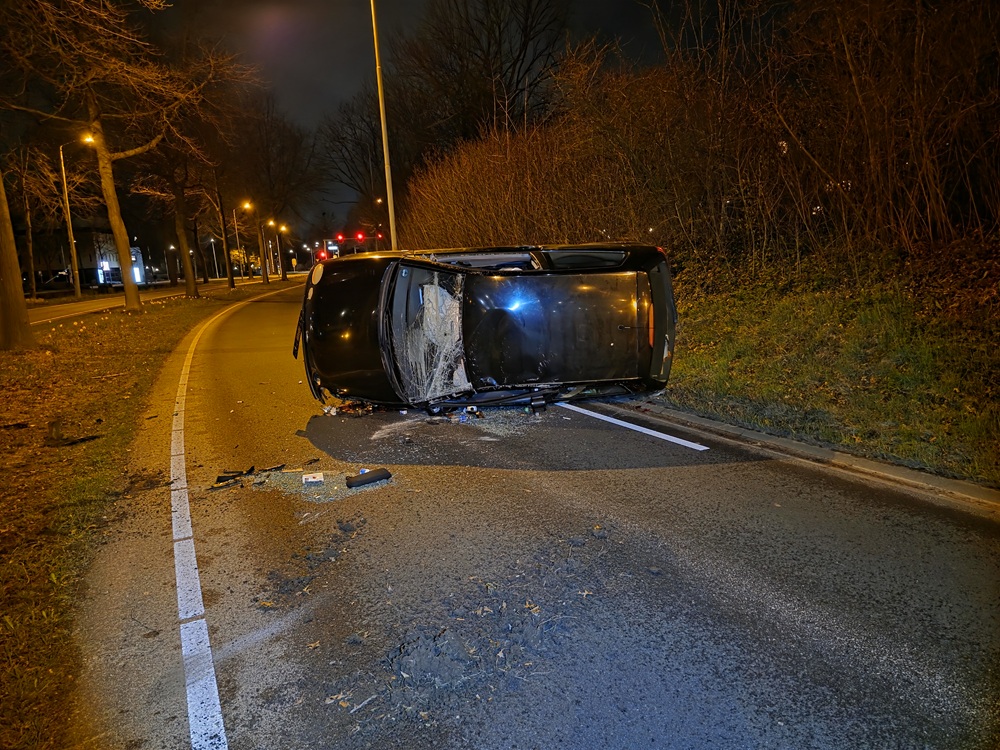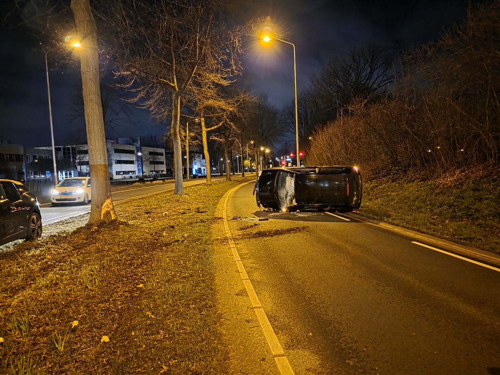 Even voor 23.00 uur botste het voertuig tegen een boom en kwam het op de zijkant tot stilstand. De auto liep forse schade op en is door een bergingsbedrijf afgevoerd. De bestuurder bleef ongedeerd.