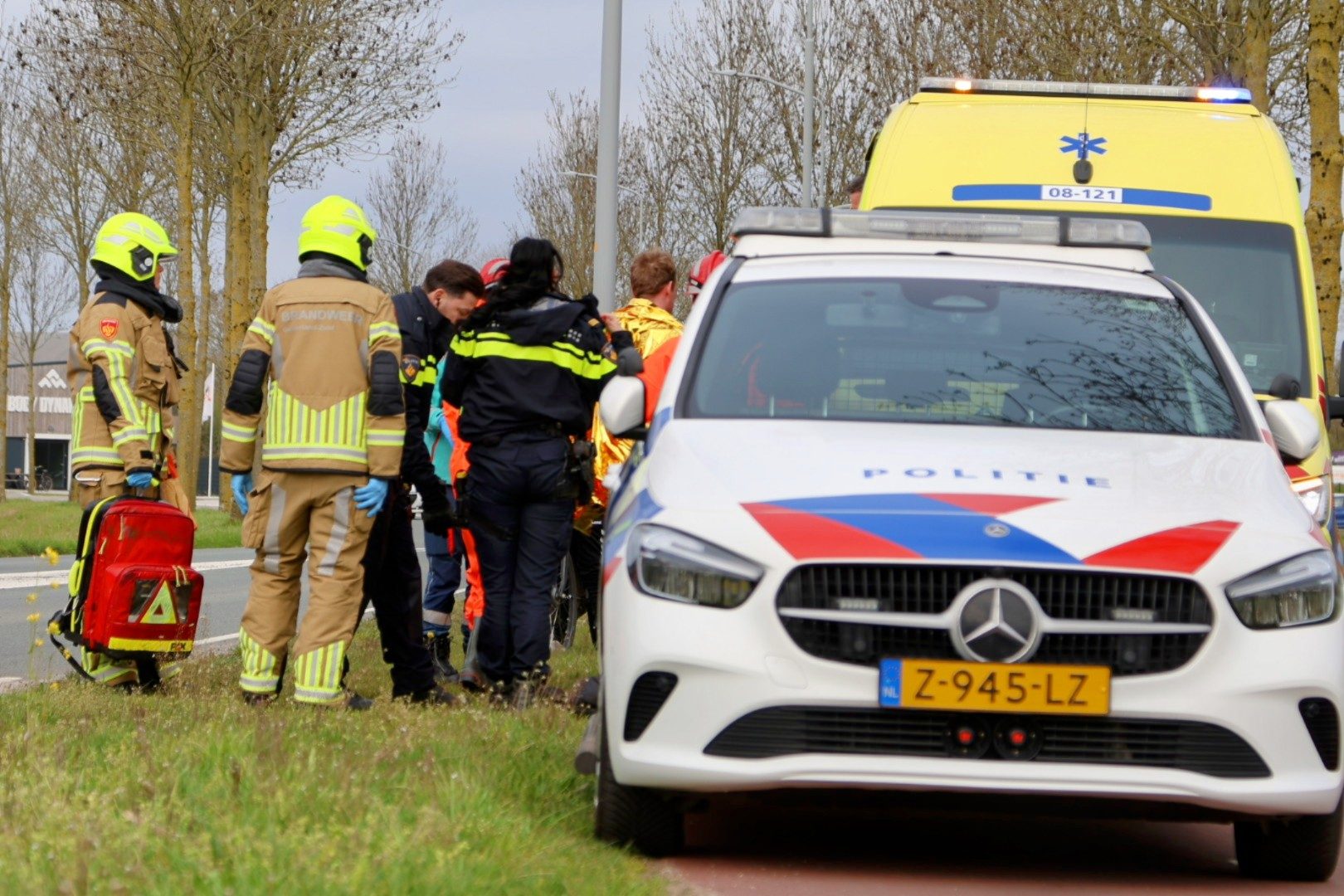Een fietser was in een sloot terechtgekomen en werd door omstanders snel uit het water gehaald. Ambulancepersoneel heeft de man in de ambulance opgewarmd met een isolatiedeken.