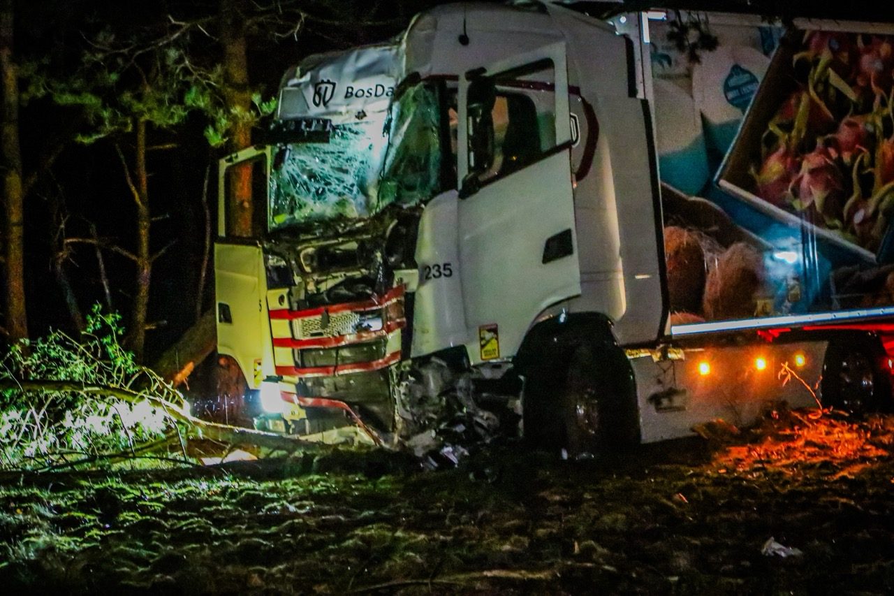 Het bleek te gaan om een vrachtwagen die met volle snelheid de berm in reed en meerdere bomen aanreed.