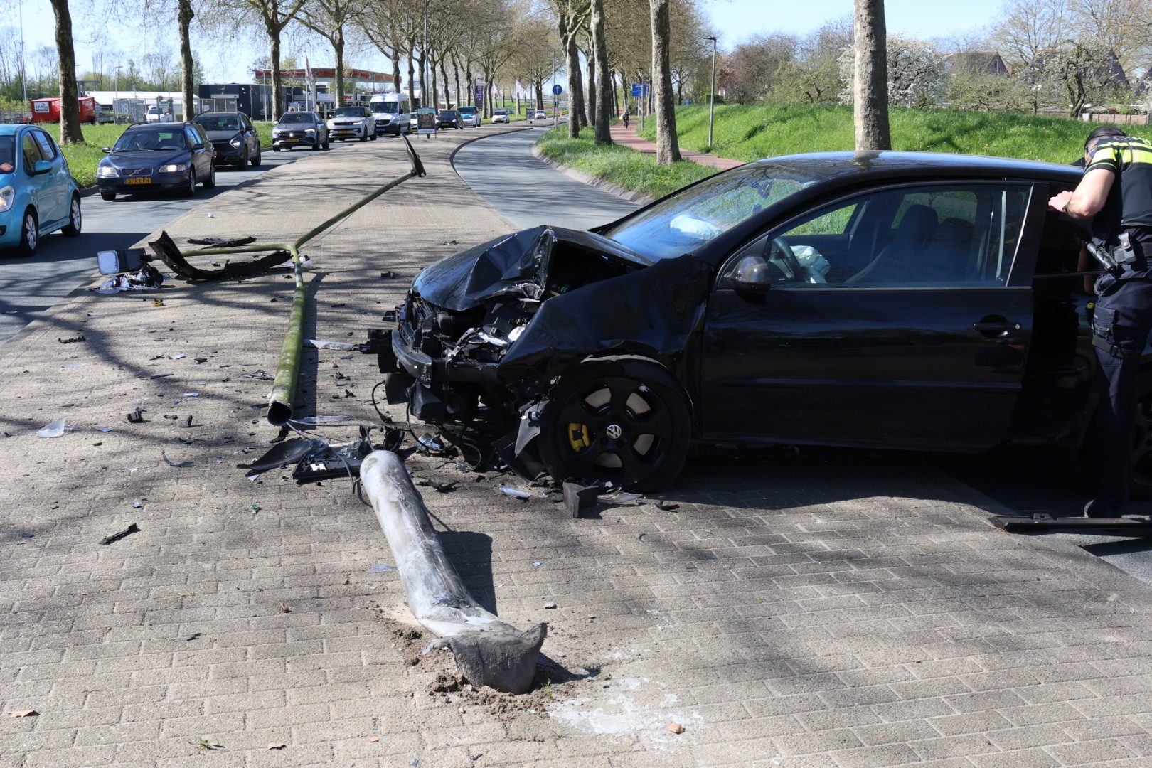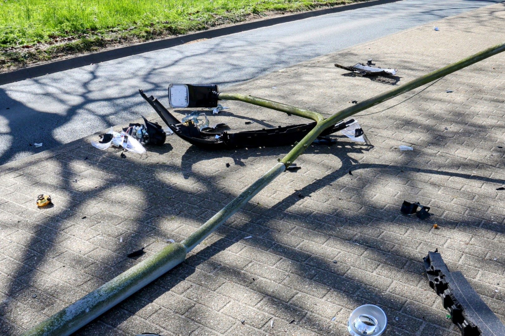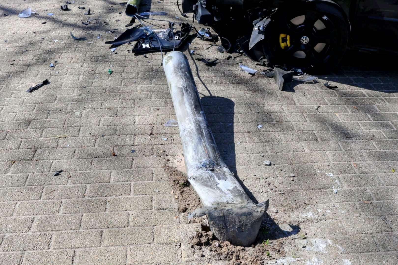 De bestuurder van een personenauto verloor de controle en reed op de middengeleider, waardoor hij een lantaarnpaal uit de grond trok. In het voertuig zaten twee personen, maar gelukkig raakten zij niet gewond.