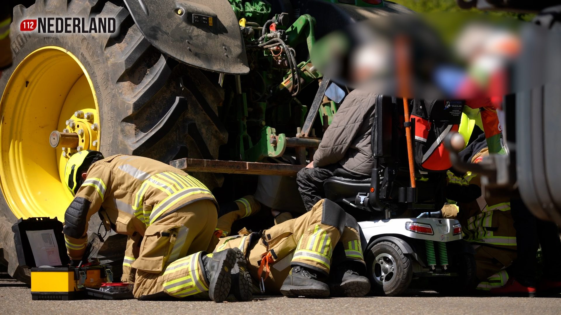 Man in scootmobiel komt bekneld te zitten achterop tractor
