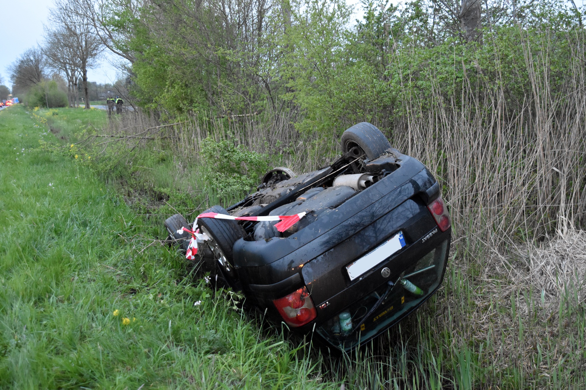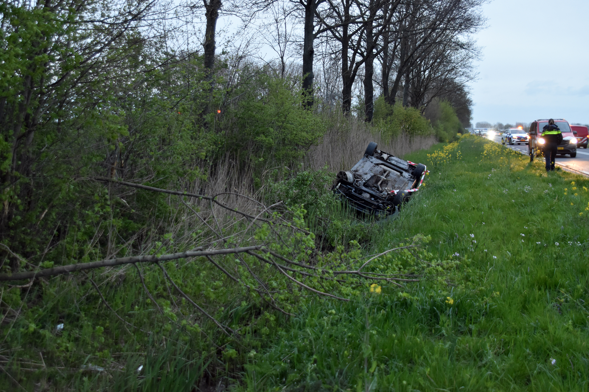 De bestuurder verloor door een nog onbekende oorzaak de macht over het stuur. De auto reed daarna tientallen meters door de berm, raakte meerdere bosschages en kwam uiteindelijk op de kop in de sloot tot stilstand. Een bergingsbedrijf voert het voertuig af.