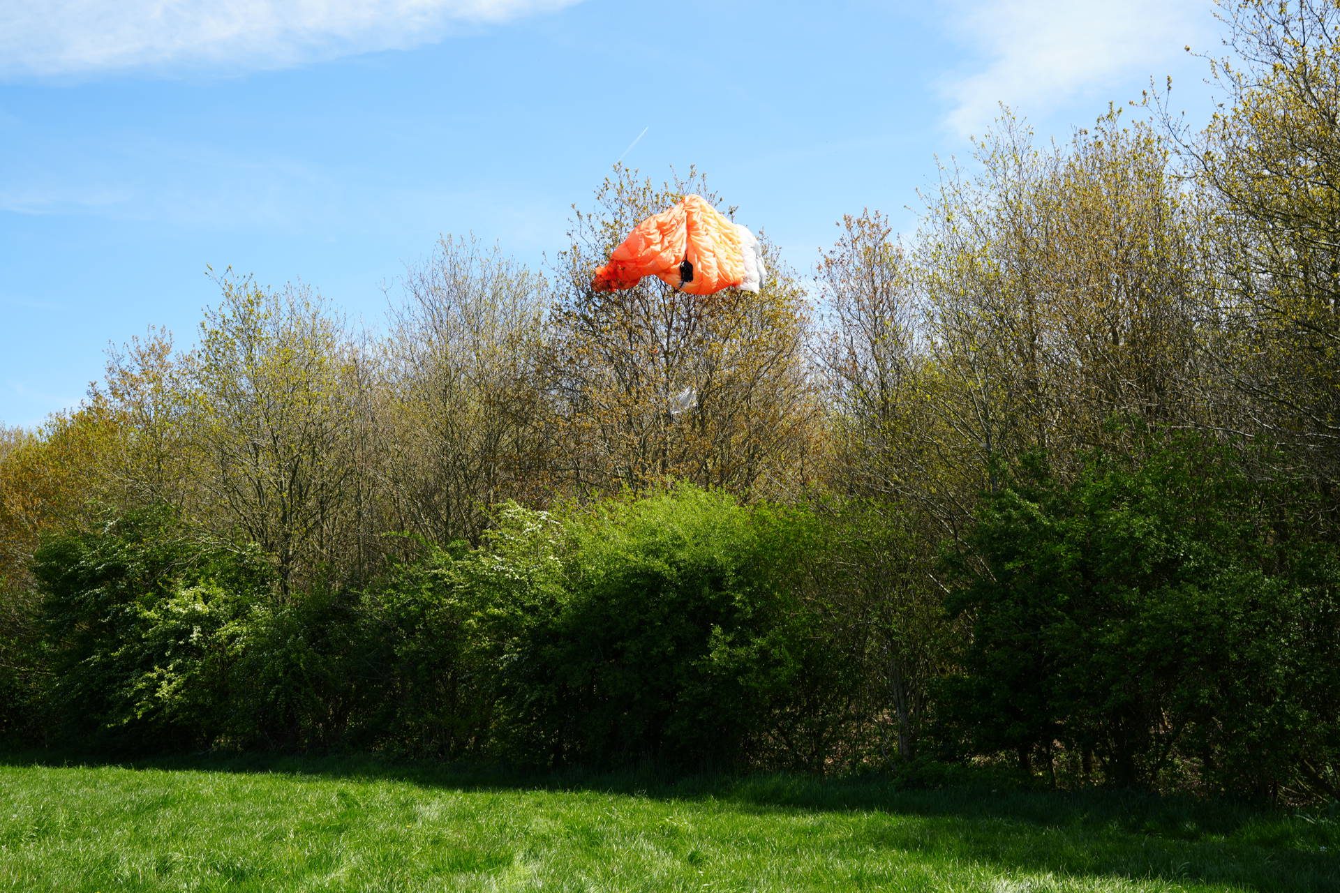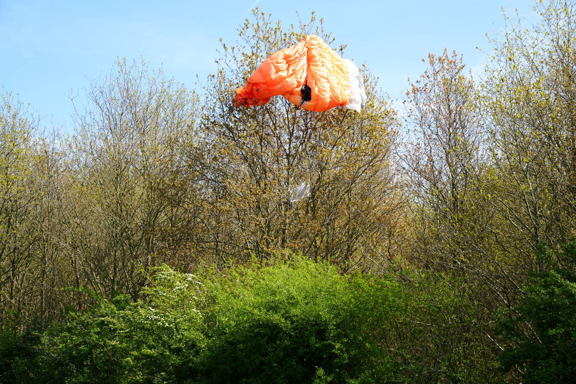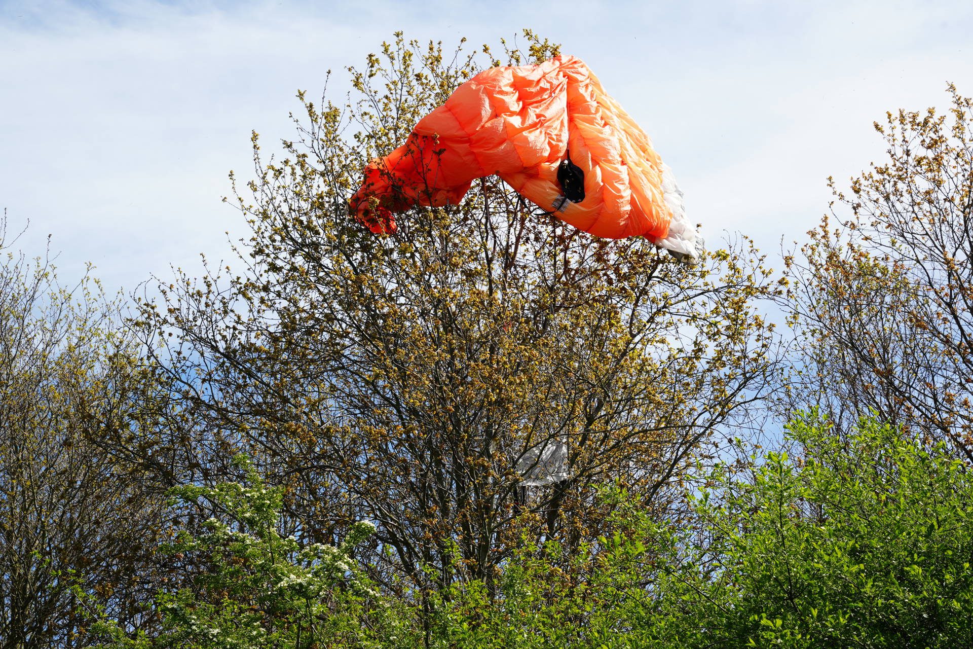 De parachutiste bleef ongedeerd. De parachute wordt door het paracentrum uit de boom verwijderd.