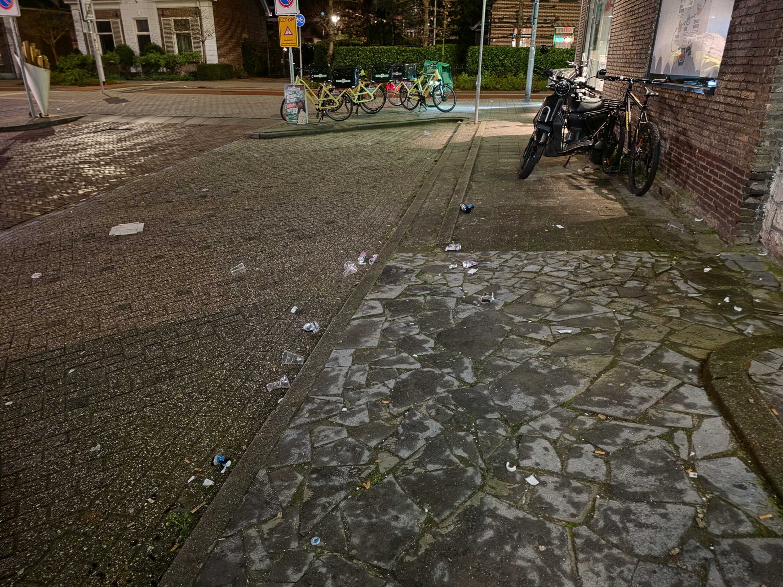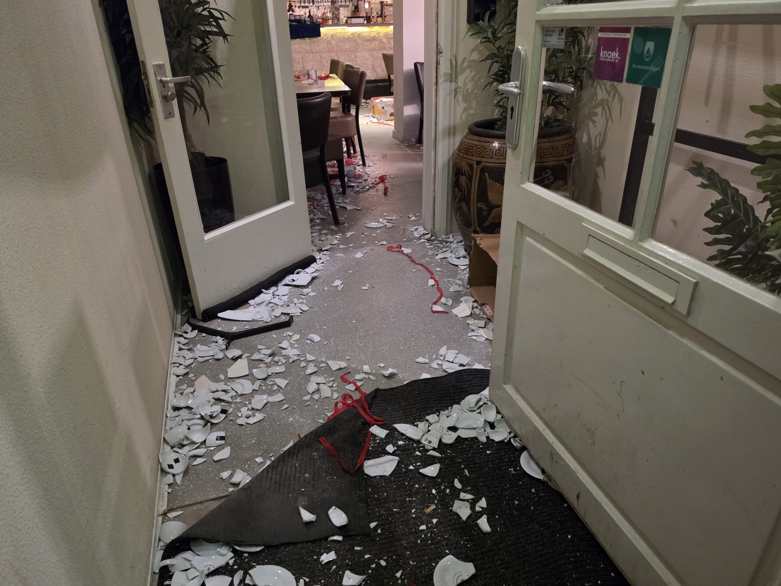 Zowel binnen in de zaak als buiten op straat lag het bezaaid met scherven. Meerdere voertuigen reden door het glas dat op de weg terechtkwam.