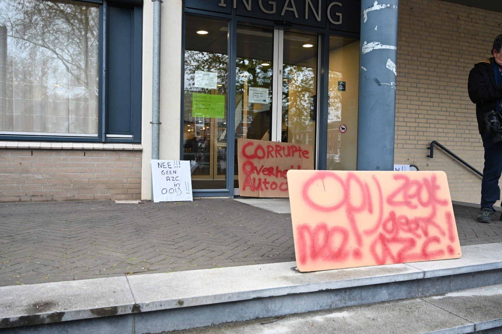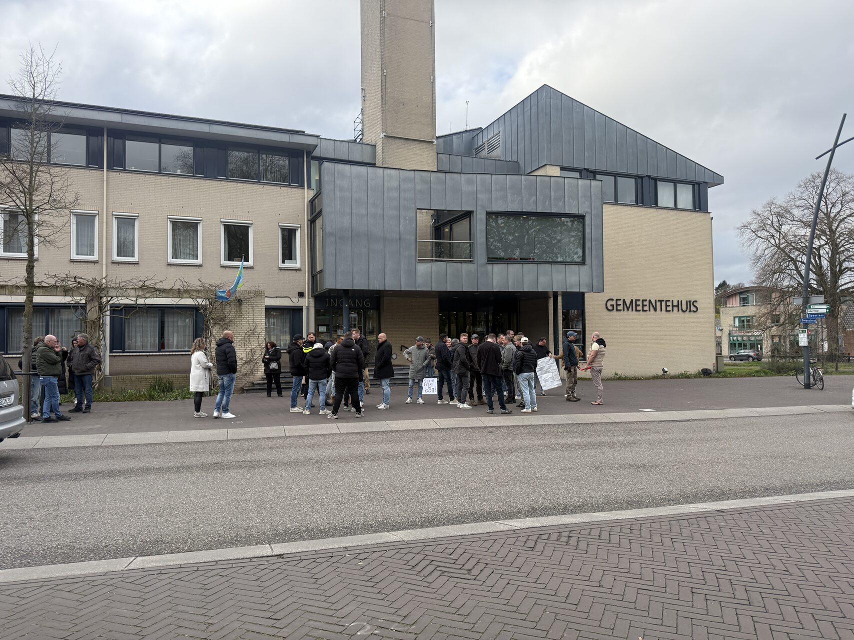 Buiten het gemeentehuis hebben zich ongeveer vijftig demonstranten verzameld. Zij voeren vreedzaam actie met borden en spandoeken om aandacht te vragen voor hun bezwaren. De bijeenkomst maakt duidelijk dat het onderwerp sterk leeft onder inwoners. Zij vragen om duidelijke communicatie en zorgvuldige besluitvorming over de mogelijke vestiging van de COA-locatie.